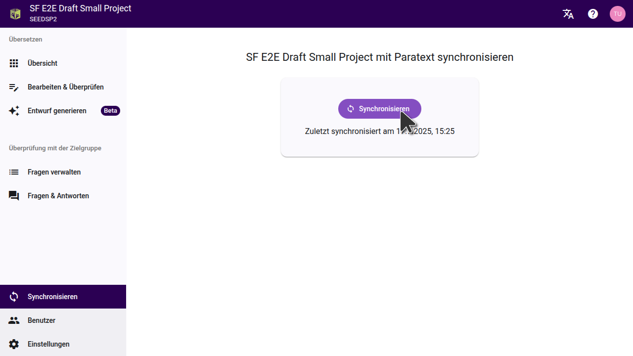 - Nachdem Du einen Entwurf zu Deinem Projekt in Scripture Forge hinzugefügt hast, vergiss bitte nicht, eine Synchronisierung durchzuführen, um die Daten auf dem Paratext-Server zu speichern. Generiere keinen neuen Entwurf, es sei denn, der erste wurde Deinem Projekt hinzugefügt. Ansonsten wird er nicht auf dem Paratext-Server gespeichert und die Daten gehen verloren.