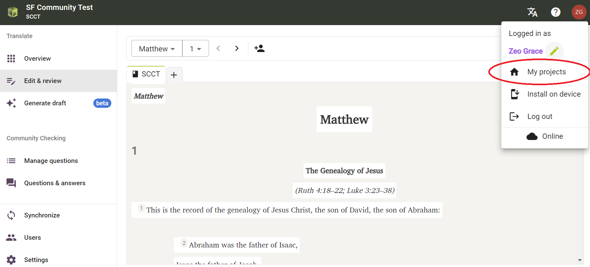 Después de conectar un proyecto Paratext a Scripture Forge, todos los usuarios que sean miembros del proyecto en Paratext (en Permisos de usuario) podrán abrir el proyecto en Scripture Forge.
