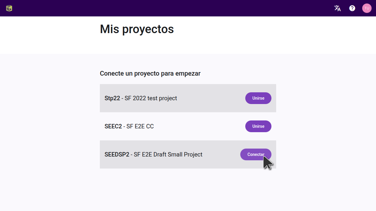 En la lista mostrada, podrá abrir proyectos si ya están conectados. También puede unirse a un proyecto o hacer clic en "Conectar" para conectar un proyecto por primera vez en Scripture Forge.