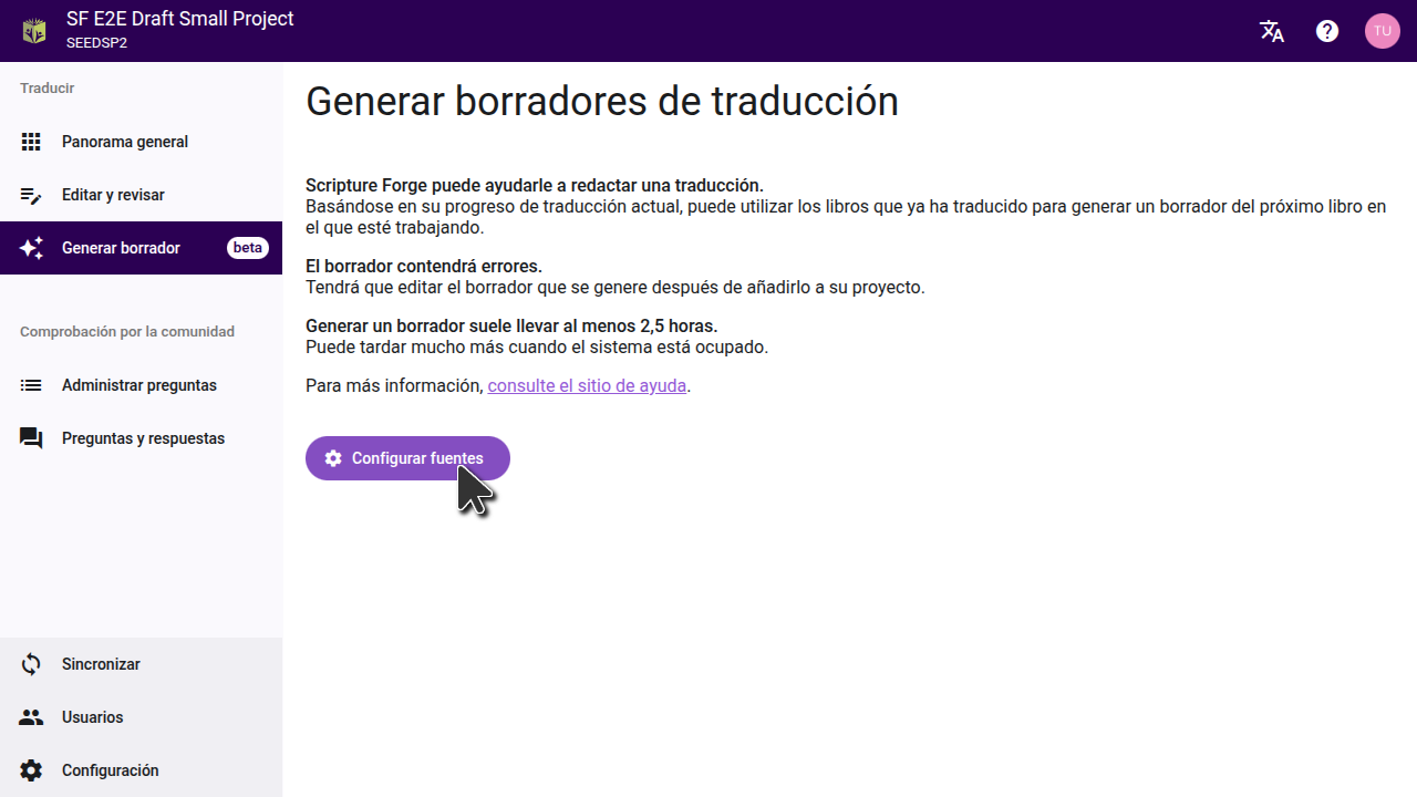 Después de rellenar el formulario, el equipo de Scripture Forge revisará su solicitud y trabajará para encontrar la mejor configuración para su proyecto. Se le proporcionará uno o más borradores para revisar. Si decide que la generación de borradores es adecuada para su proyecto, el equipo habilitará la generación de borradores en su proyecto y le guiará en el proceso de selección de los ajustes que hayan resultado mejores.