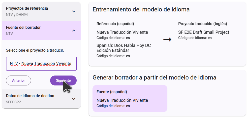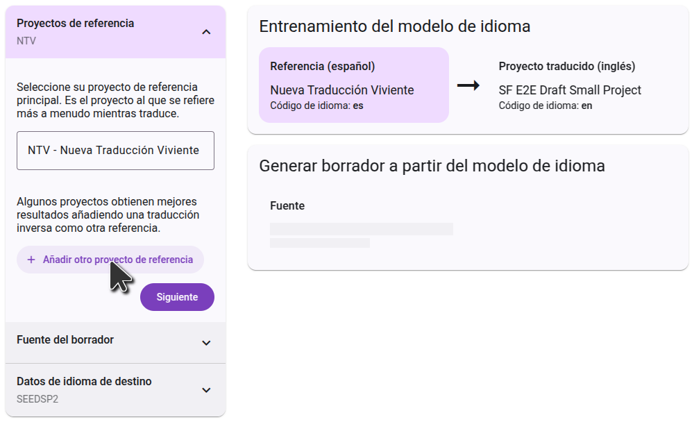 A la derecha, verá un diagrama de cómo se utilizarán los proyectos seleccionados para generar el borrador. En el primer paso, el modelo lingüístico aprenderá comparando los proyectos de referencia con el proyecto traducido. En el segundo paso, utilizará esos conocimientos para traducir el proyecto fuente.