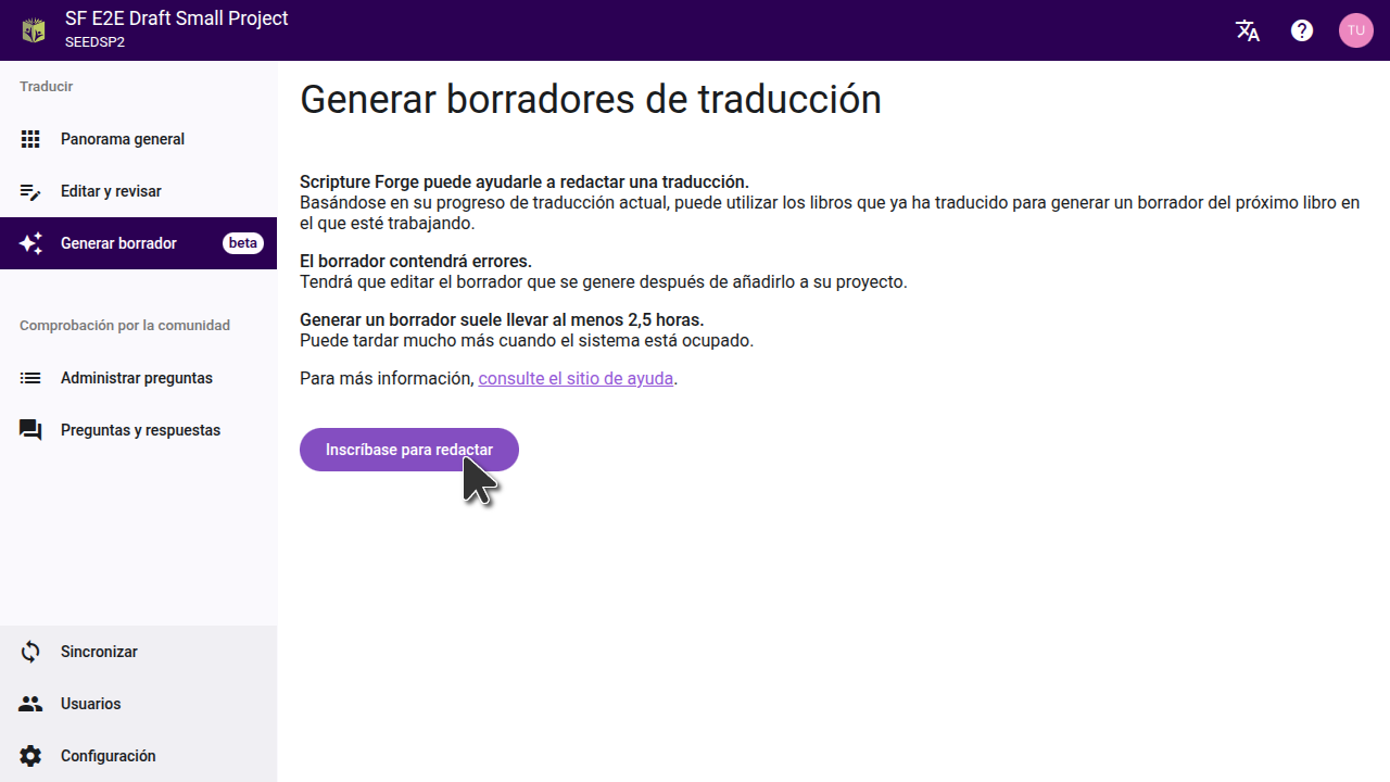 Para generar borradores en Forja de Escritura, haga clic en el botón "Generar borrador" en el menú principal. A continuación, haga clic en el botón "Regístrese para generar borradores" y rellene el formulario que se abre para obtener acceso a su proyecto. Los proyectos de retrotraducción están activados por defecto y no necesitan rellenar el formulario.