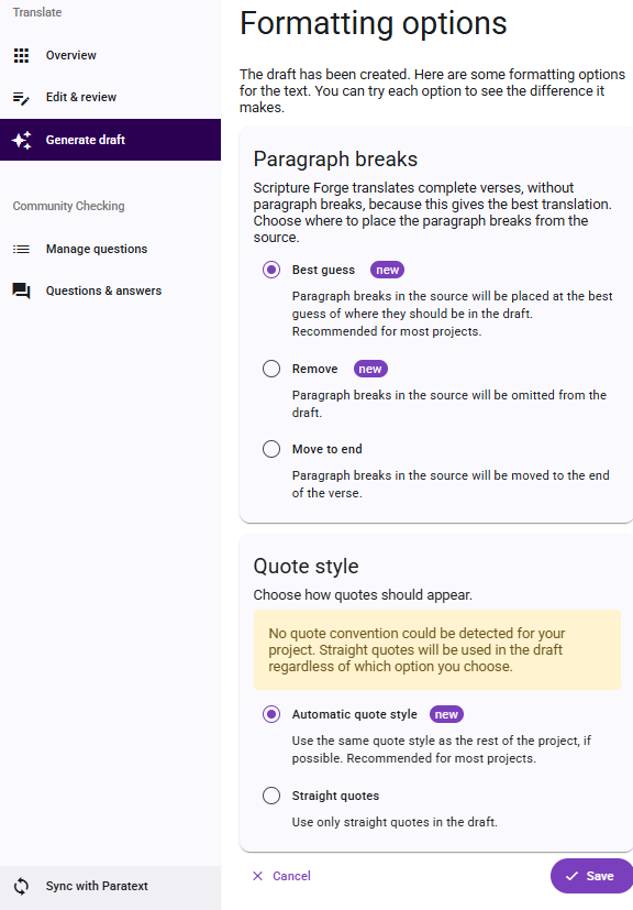 Undetermined quote styles: If Scripture Forge cannot confidently determine the quote style, you will be notified so that you can edit manually.
