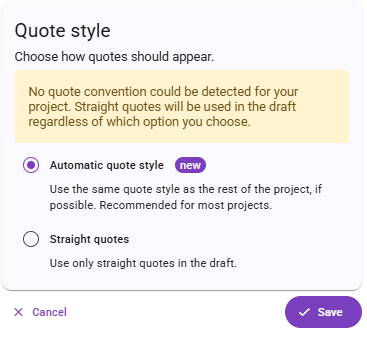 - Review the output: If quote styles are applied, you will see the project’s preferred quotation marks. If the style could not be determined, you will receive a clear notification to edit the quotes manually when editing the draft.