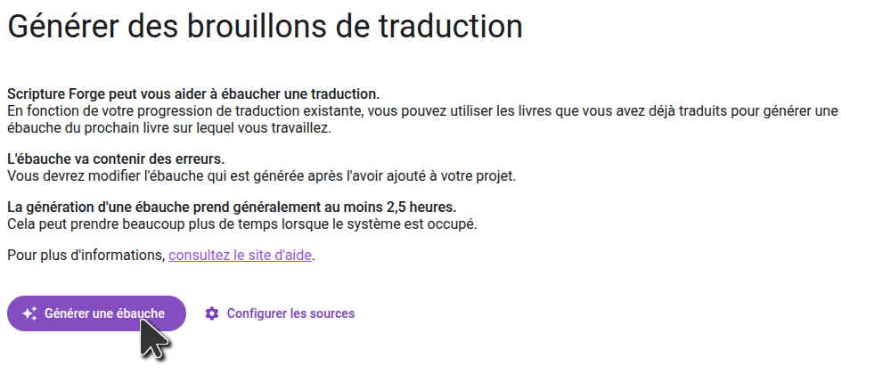 Une fois que votre projet a ét é activé et que les sources ont été configurées, cliquez sur le bouton Générer l'ébauche pour démarrer :