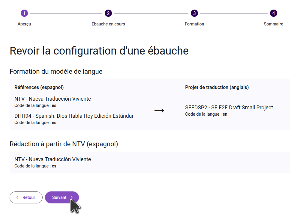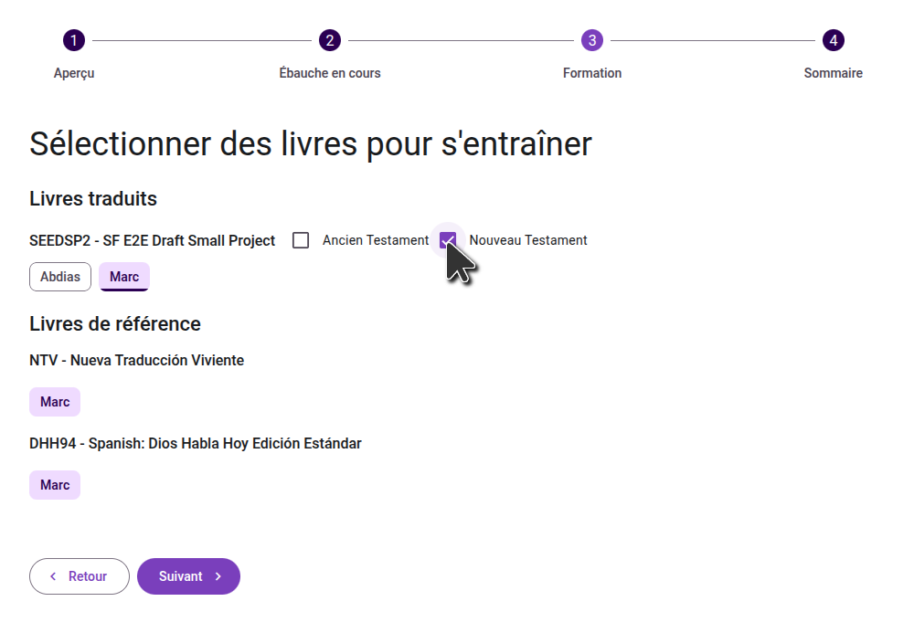 À l'étape suivante, sélectionnez les livres à utiliser pour former le modèle de langue, tant dans votre projet principal que dans les projets de référence. Choisissez tous les livres de votre projet qui ont été correctement revus. Bien qu'ils n'aient pas besoin d'être vérifiés par un consultant, ils devraient être des traductions exactes du livre source.