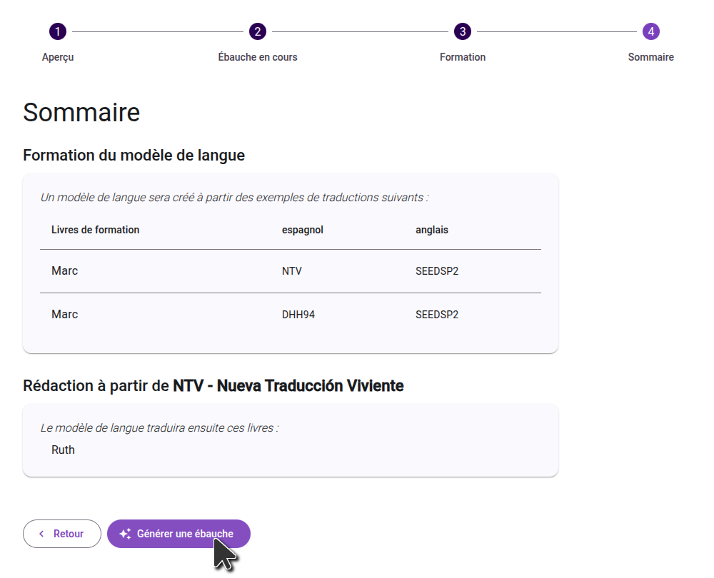 Lors de la dernière étape, consultez les livres que vous avez sélectionnés pour former le modèle, et les livres que vous avez sélectionnés pour ébaucher. Si vous devez apporter des modifications, vous pouvez passer aux étapes précédentes. Une fois que vous êtes satisfait de vos sélections, cliquez sur le bouton "Générer un brouillon" pour démarrer le processus.