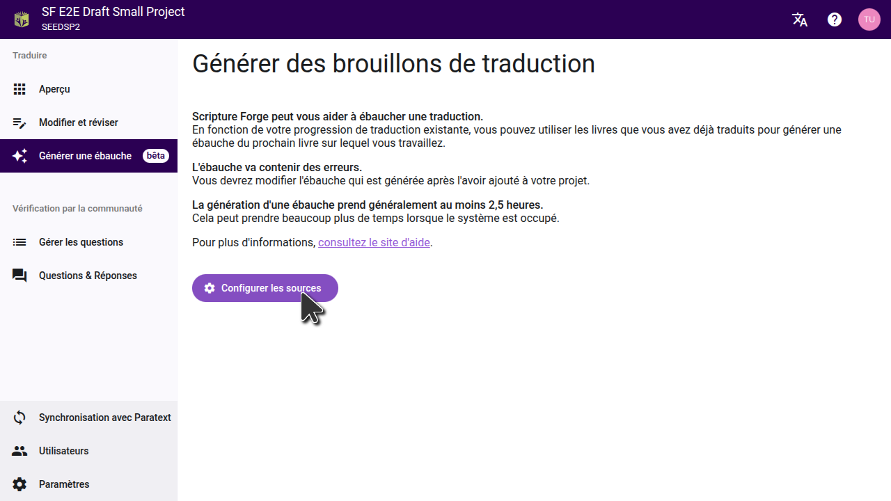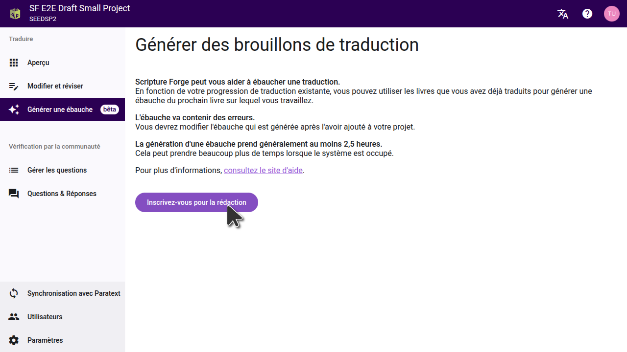Pour générer des ébauches dans la Forge des Écritures, cliquez sur le bouton « Générer une ébauche » dans le menu principal. Cliquez ensuite sur le bouton "S'inscrire à l'ébauche", et remplissez le formulaire qui s'ouvre, pour avoir accès à votre projet. Les projets de retraduction sont activés par défaut et n'ont pas besoin de remplir le formulaire.