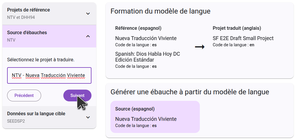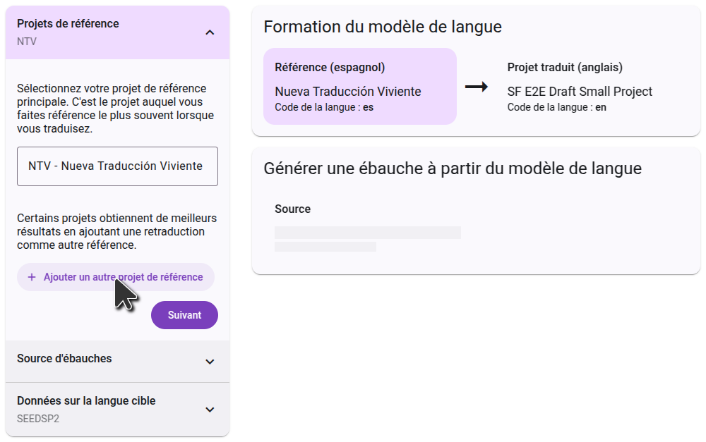 Sur le côté droit, vous verrez un diagramme de la façon dont les projets que vous avez sélectionnés seront utilisés pour générer l'ébauche . Dans un premier temps, le modèle linguistique apprend en comparant les projets de référence au projet traduit. Dans un deuxième temps, il utilisera ces connaissances pour traduire le projet source.