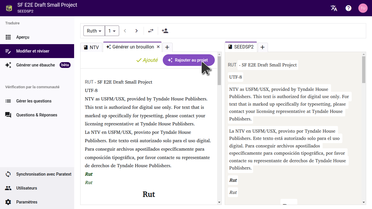Une fois que vous avez importé l'ébauche dans un projet, synchronisez le projet dans Scripture Forge puis faites un Envoyer/Recevoir dans Paratext pour voir les changements.