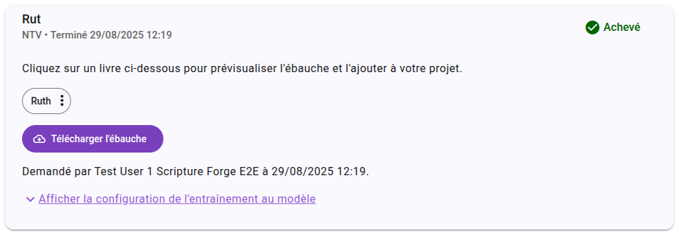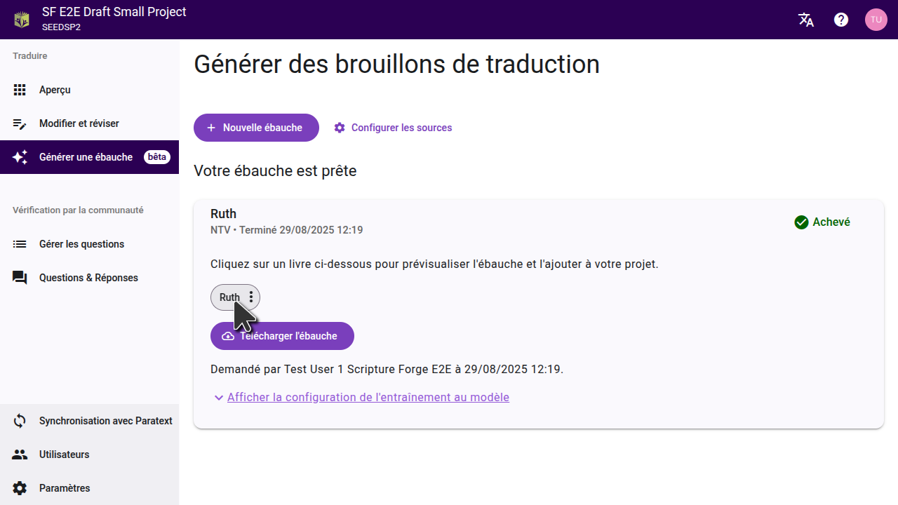 Lorsque votre ébauche est terminée, Scripture Forge vous indiquera qu'il est prêt et affichera la liste des livres qui ont été rédigés.