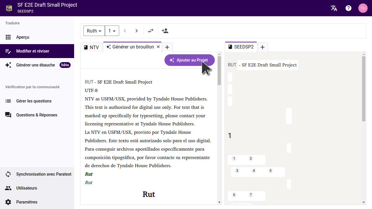 L'ébauche créée par Scripture Forge ne sera pas automatiquement importé dans votre projet. Vous pouvez prévisualiser l'ébauche et ensuite importer un chapitre ou un livre à la fois dans votre projet, ou dans un projet différent.