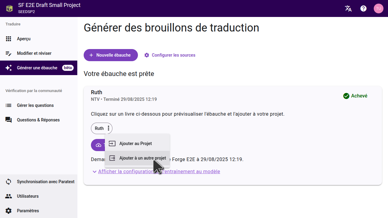 Si vous préférez ne pas importer l'ébauche directement dans votre projet, vous pouvez également télécharger l'ébauche sous forme de fichiers USFM. Dans la page "Générer l'ébauche ", cliquez sur "Télécharger l'ébauche ", et extrayez les fichiers sur votre ordinateur. Vous pouvez ensuite importer ces fichiers dans un projet dans Paratext.