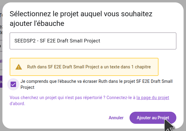 Dans la boîte de dialogue qui s'ouvre, sélectionnez le projet dans lequel vous voulez importer l'ébauche. Si le projet n'a pas encore été connecté à Scripture Forge, vous devrez d'abord le connecter. Important: Importer l'ébauche remplacera tout contenu existant dans le projet pour ce livre.