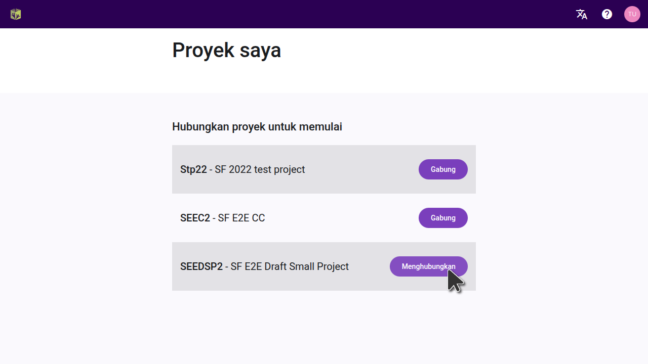 Dari daftar yang ditampilkan, Anda akan dapat membuka proyek jika sudah terhubung. Anda juga dapat bergabung dengan sebuah proyek atau klik "Hubungkan" untuk menghubungkan sebuah proyek untuk pertama kalinya di Scripture Forge.