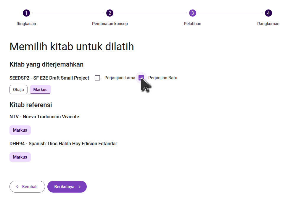 On the next step, select the books to use to train the language model, both in your main project, and in the reference projects. Choose all the books in your project that have been adequately reviewed. While they don't need to be consultant-checked, they should be accurate translations of the source book.
