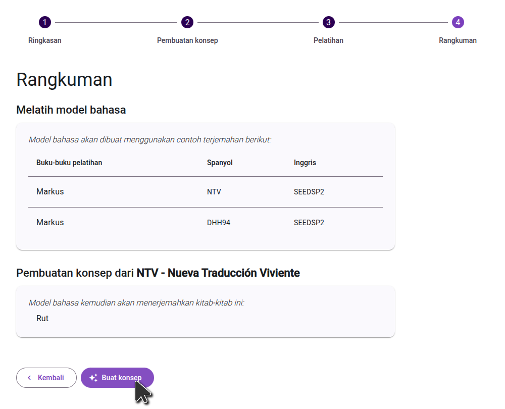 On the first screen, review the configured sources and language codes and verify that they are correct. Then go to the next step.