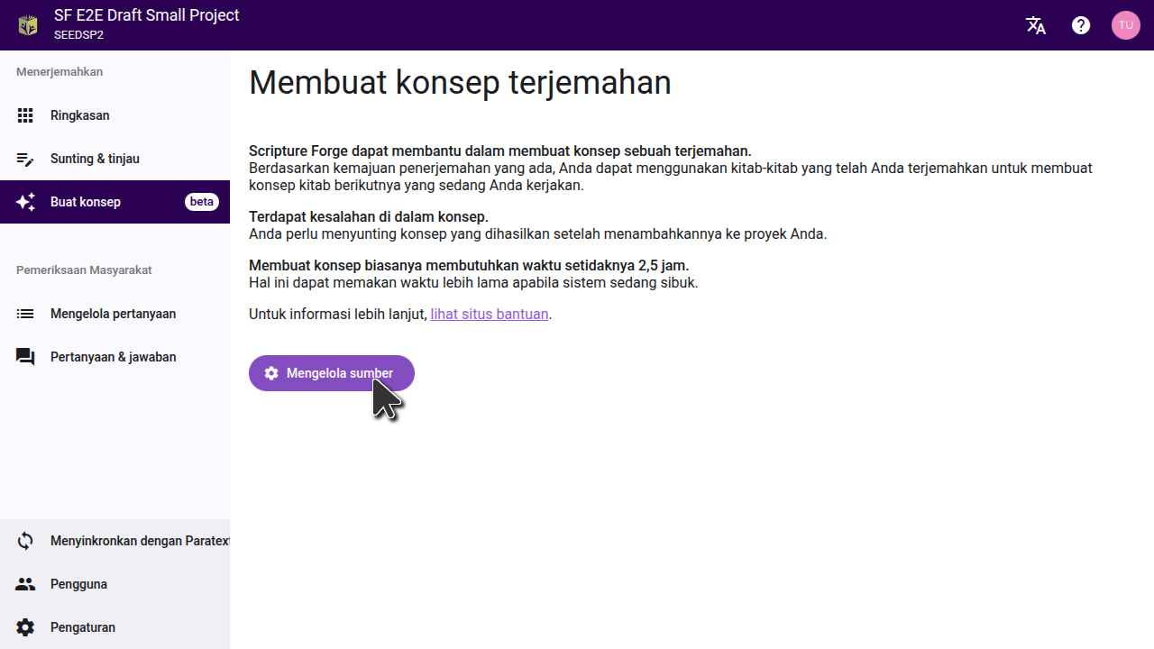 After you fill out the form, the Scripture Forge onboarding team will review your request and work to find the best settings for your project. You will be provided with one or more drafts to review. If you decide that generating drafts is right for your project, the team will enable drafting on your project and guide you through the process of selecting the settings that were found to be best.