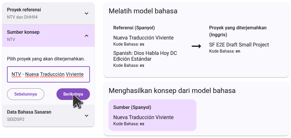 On the right side, you will see a diagram of how the projects you selected will be used to generate the draft. In the first step, the language model will learn by comparing the reference projects to the translated project. In the second step, it will use that knowledge to translate the source project.