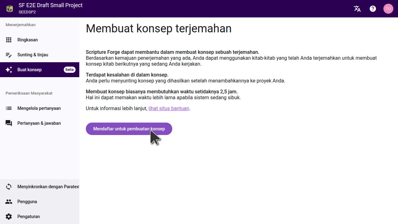 To generate drafts in Scripture Forge, click on the "Generate Draft" button in the main menu. Then click the "Sign up for Drafting" button, and fill out the form that opens, to get access for your project. Back translation projects are enabled by default and do not need to fill out the form.