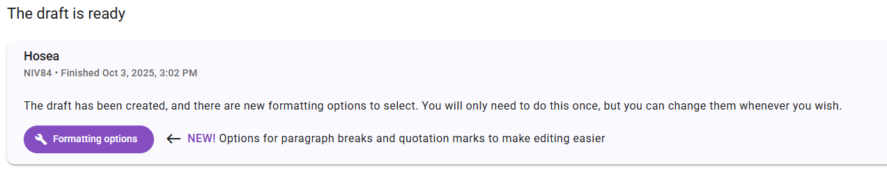 The button for the formatting options is on the “Generate Draft” page. When you change the settings a preview of the changes will be shown. Changing the option does not affect drafts that have been added to a project; changing the options only affects the draft previews before they are added to a project.