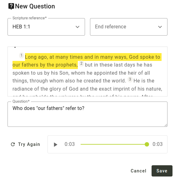 A question can apply to a single verse, or multiple verses. Type a reference into the Scripture reference box, or click the dropdown arrow to select a book, chapter, and verse. If you want the question to span multiple verses, enter an end reference in the second box. Once you've input a reference, the text will show up, with the verses you chose highlighted.