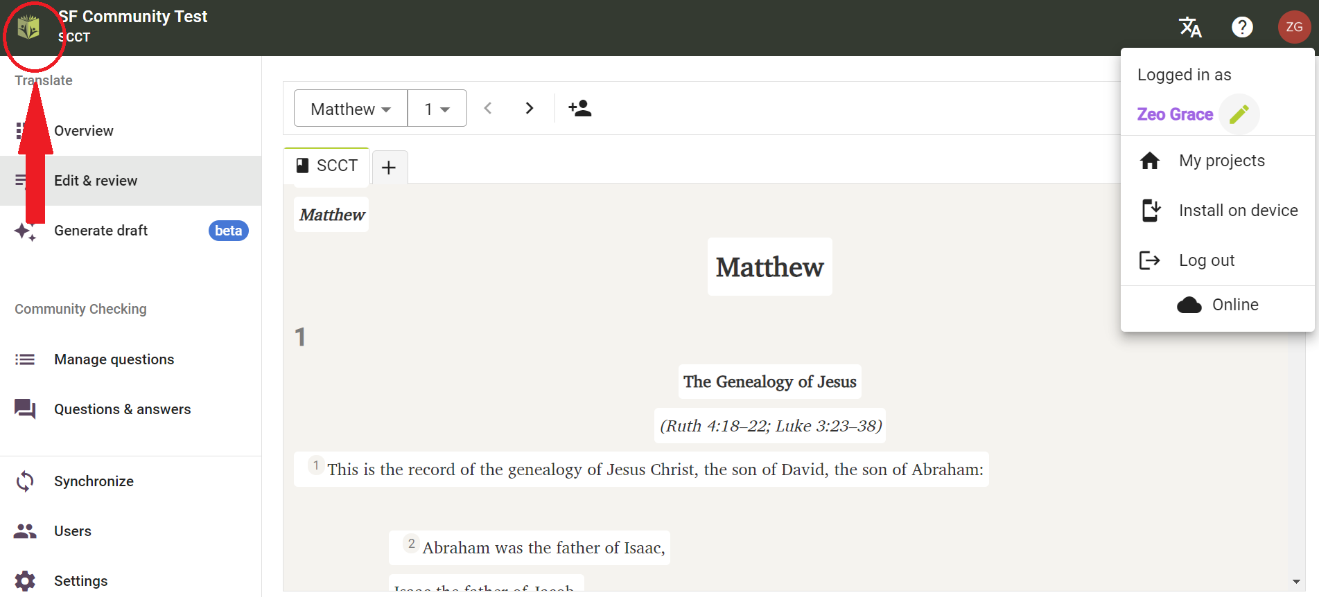 To view the list of projects you have access to in Paratext, click on the Scripture Forge icon on the top left of the screen.