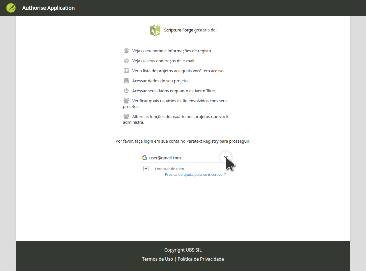 Next, authorize Scripture Forge to connect with your Paratext account. When prompted, type the email address associated with your Paratext Registry account and then click the Login arrow (or press the Enter key).