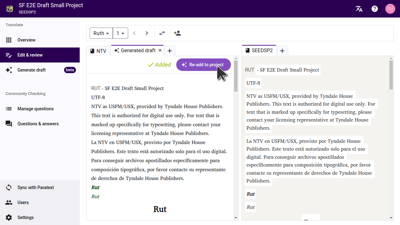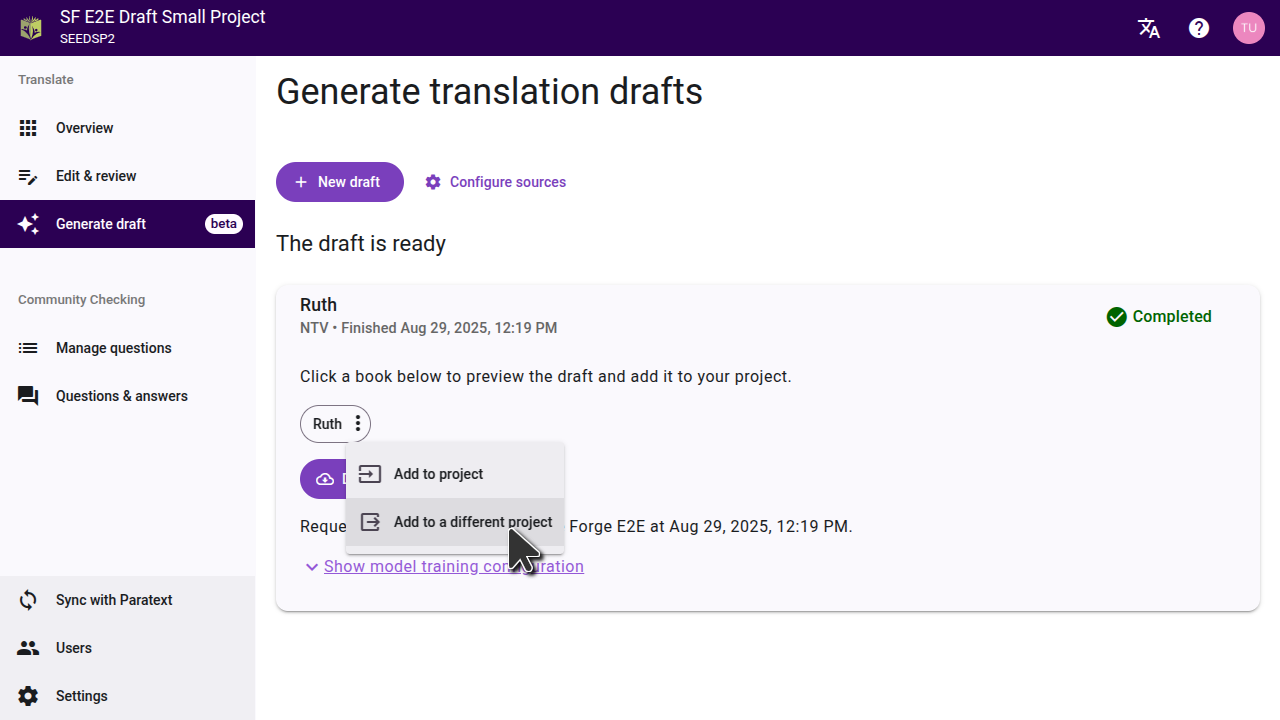 The draft that Scripture Forge created will not be automatically imported to your project. You can preview the draft and then import a chapter or a book at a time into your project, or into a different project.