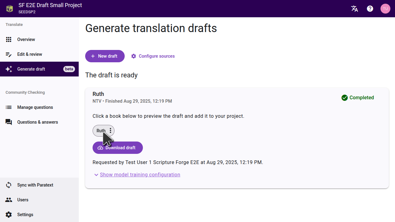 When your draft is finished, Scripture Forge will indicate that it's ready and display the list of books that were drafted.