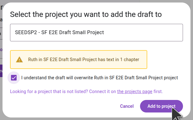 In the dialog that opens, select the project you want the draft to be imported to. If the project hasn't been connected in Scripture Forge yet, you will need to connect it first. Important: Importing the draft will replace any existing content in the project for that book.